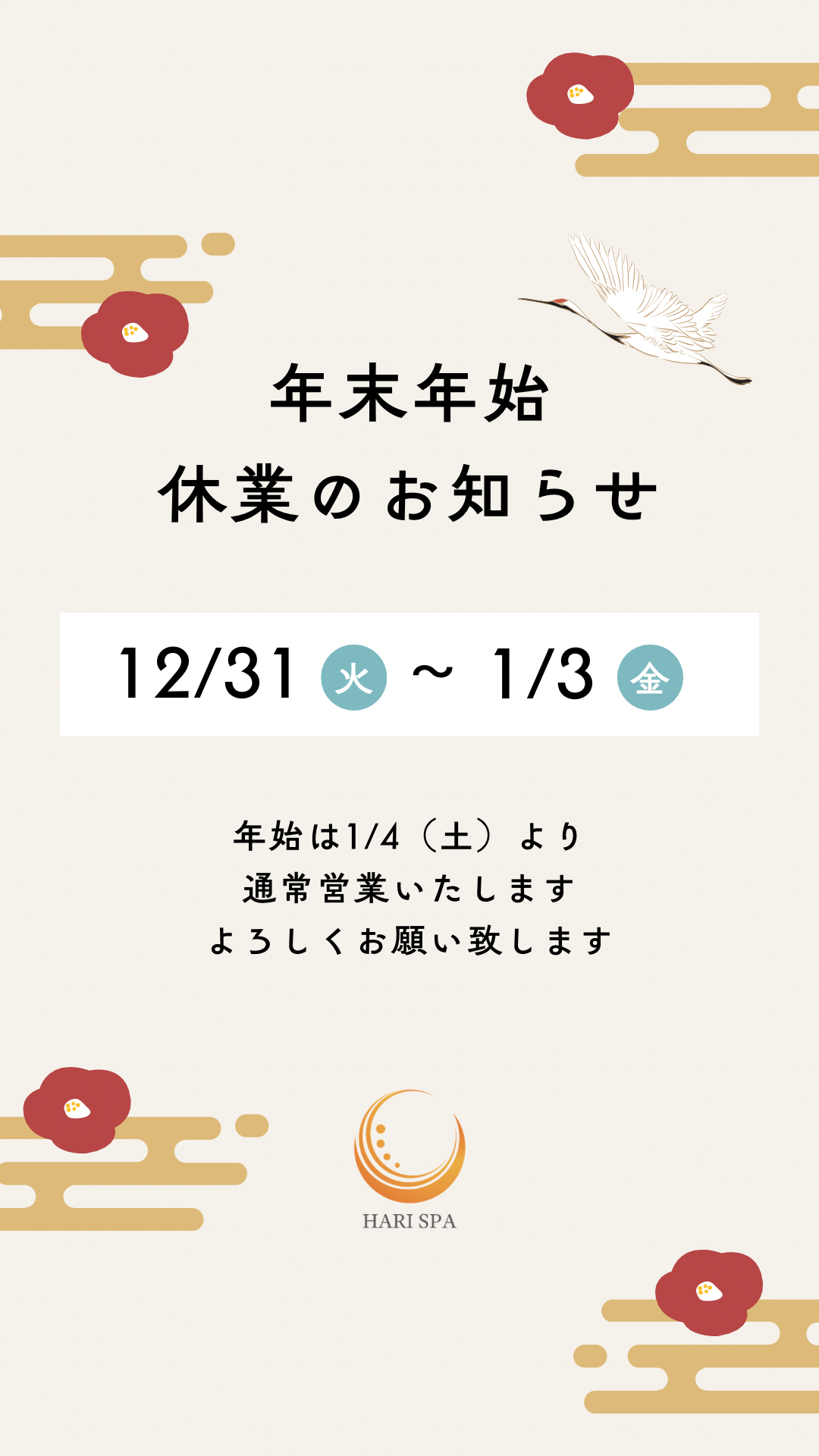 【年末年始の営業につきまして】 2024/12/21 こんにちは!ハリスパ堀江院です。 いつも当院をご利用いただきありがとうございます。 年末年始の営業につきまして、ご確認くださいませ。 2024年も、残りわずかとなりました。 まだまだご予約可能ですので、たくさんのご来院、お待ちしております。